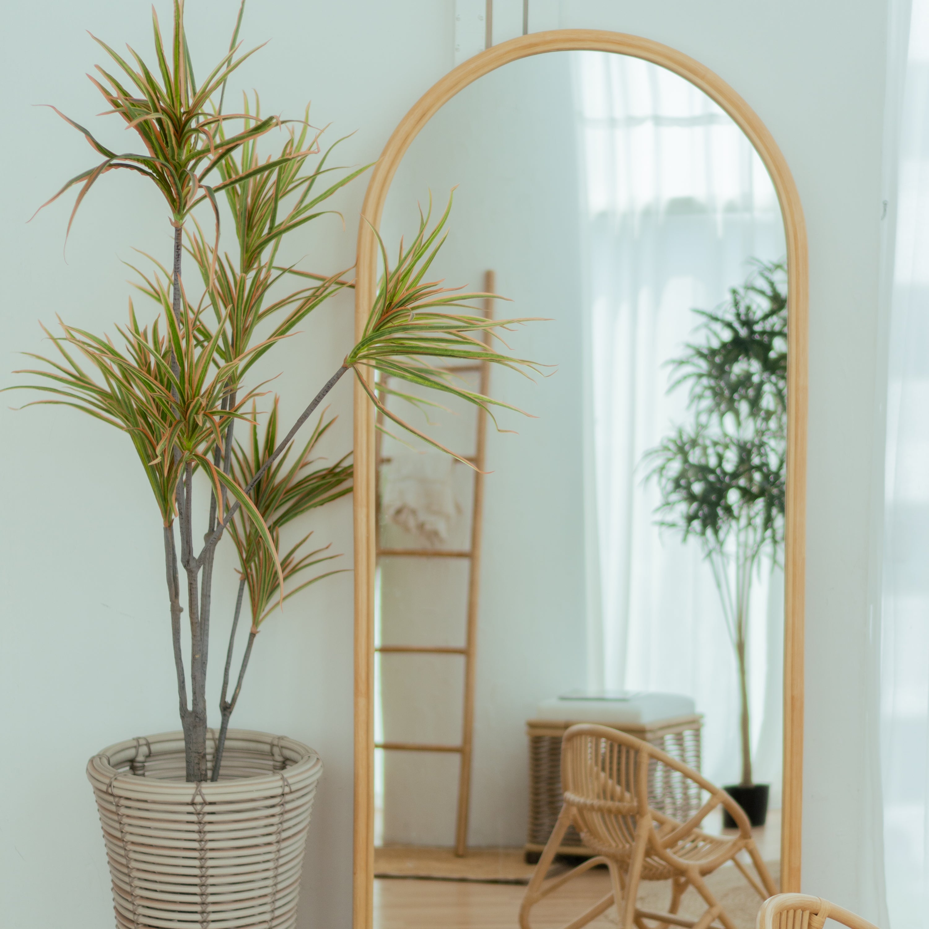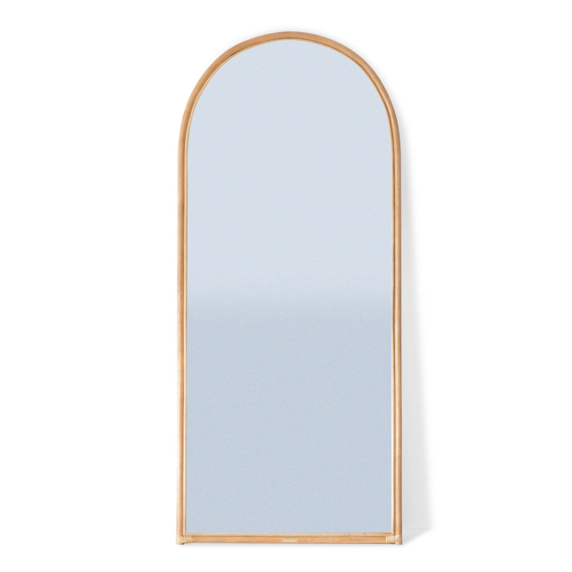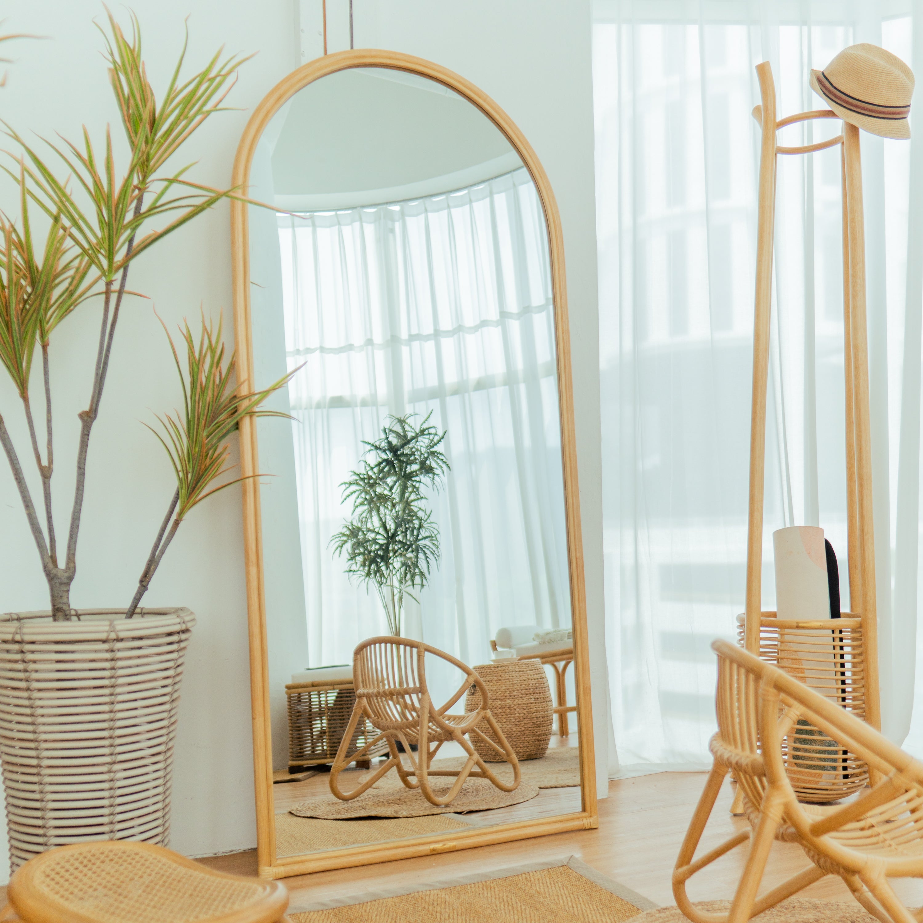 Everyone loves an arch. A simple outline of an arch crafted from rattan, frames a mirror. Rustic yet elegant.