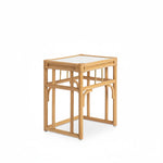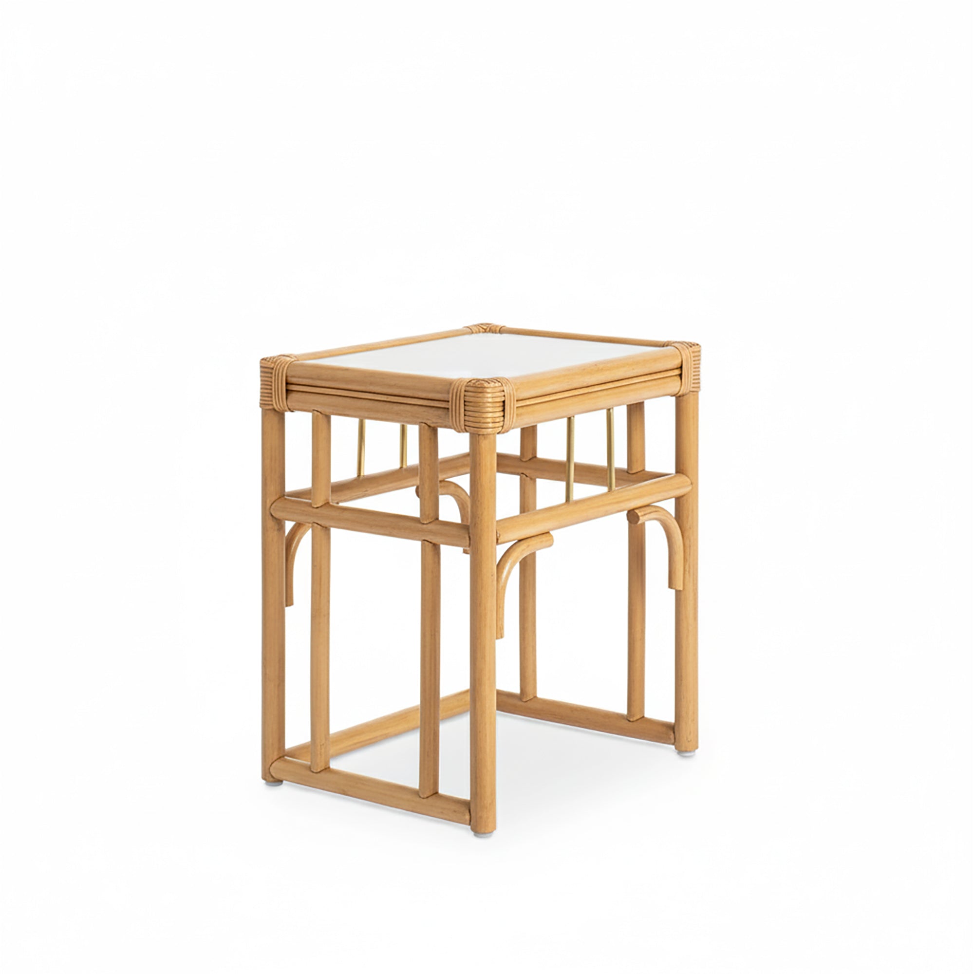 Made from sustainable rattan treated with eco-friendly clear lacquer and natural wicker, fluted tempered glass, and solid brass for a touch of classic elegance.