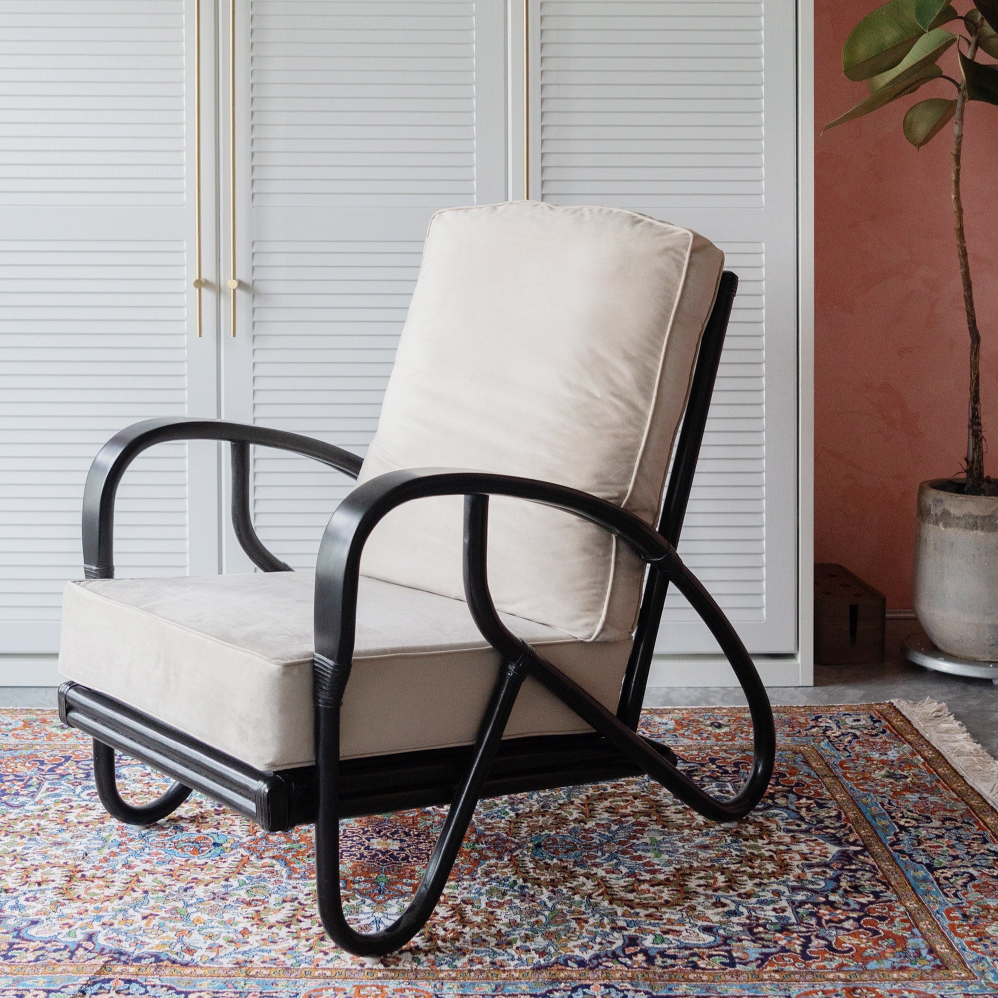 Art deco inspired geometry in the skillfully bent rattan frame treated with eco-friendly black lacquer coat, and understated classic elegance: black leather bindings.