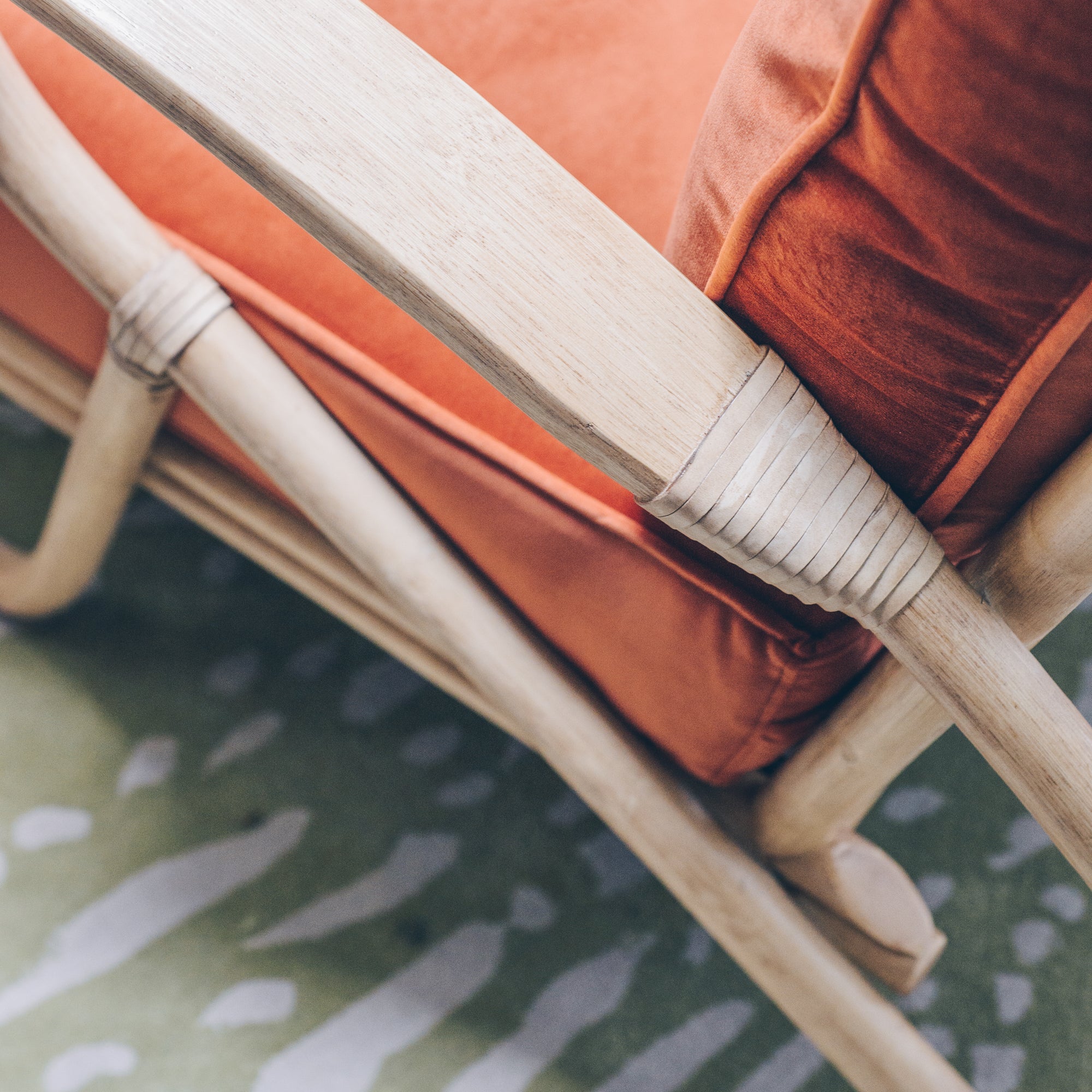 At first glance, most would assume that the armrests are made of wood. On closer inspection, feel under the armrest and you will notice that the armrest is actually made of two pieces of rattan, with the top surface sanded and shaped down to look like a seamless single piece. This creates comfort for use as an armrest, and also gives a new form and aesthetic to the way rattan is normally used.