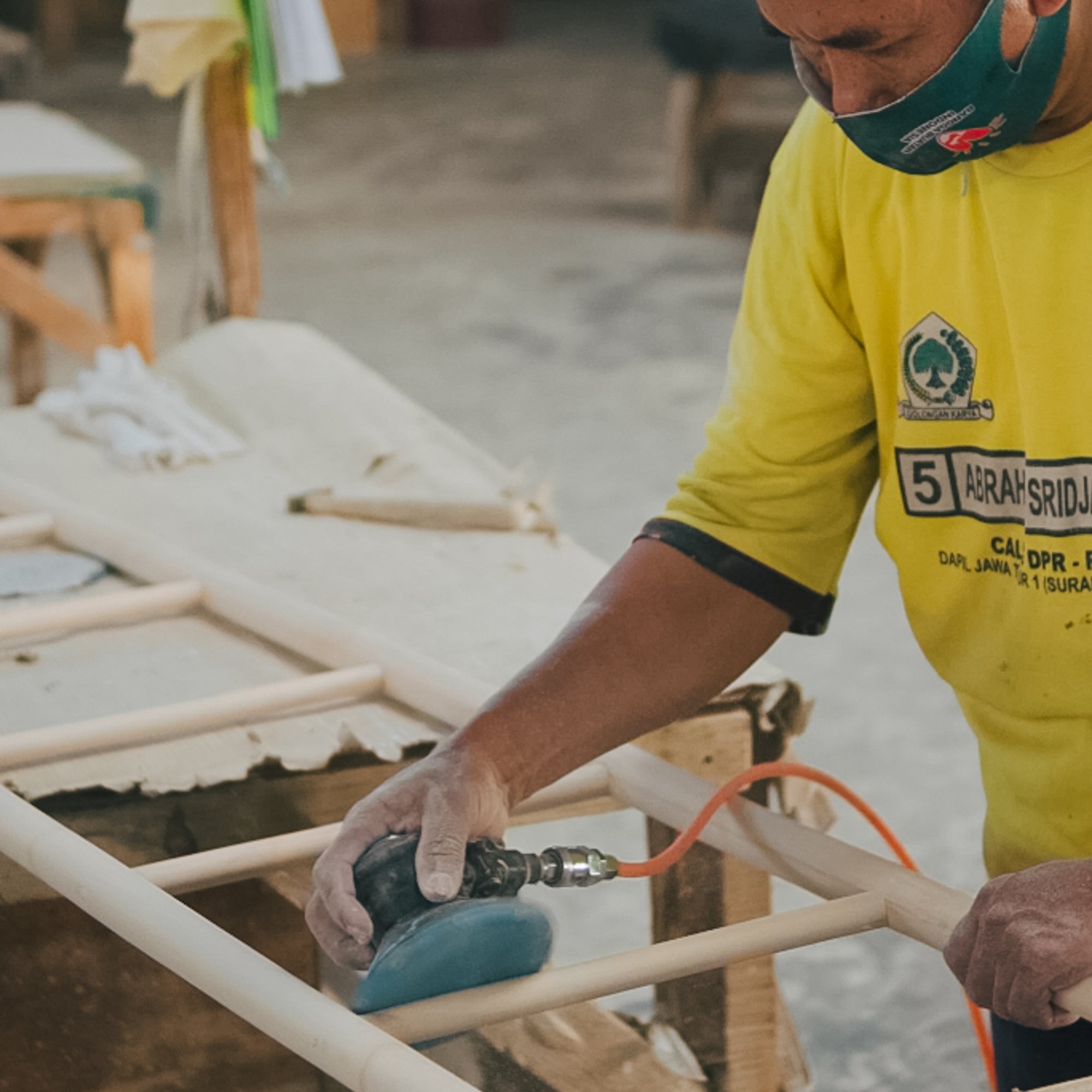 In the final phases of sanding, our craftsman checks the smoothness with the touch of his hands.