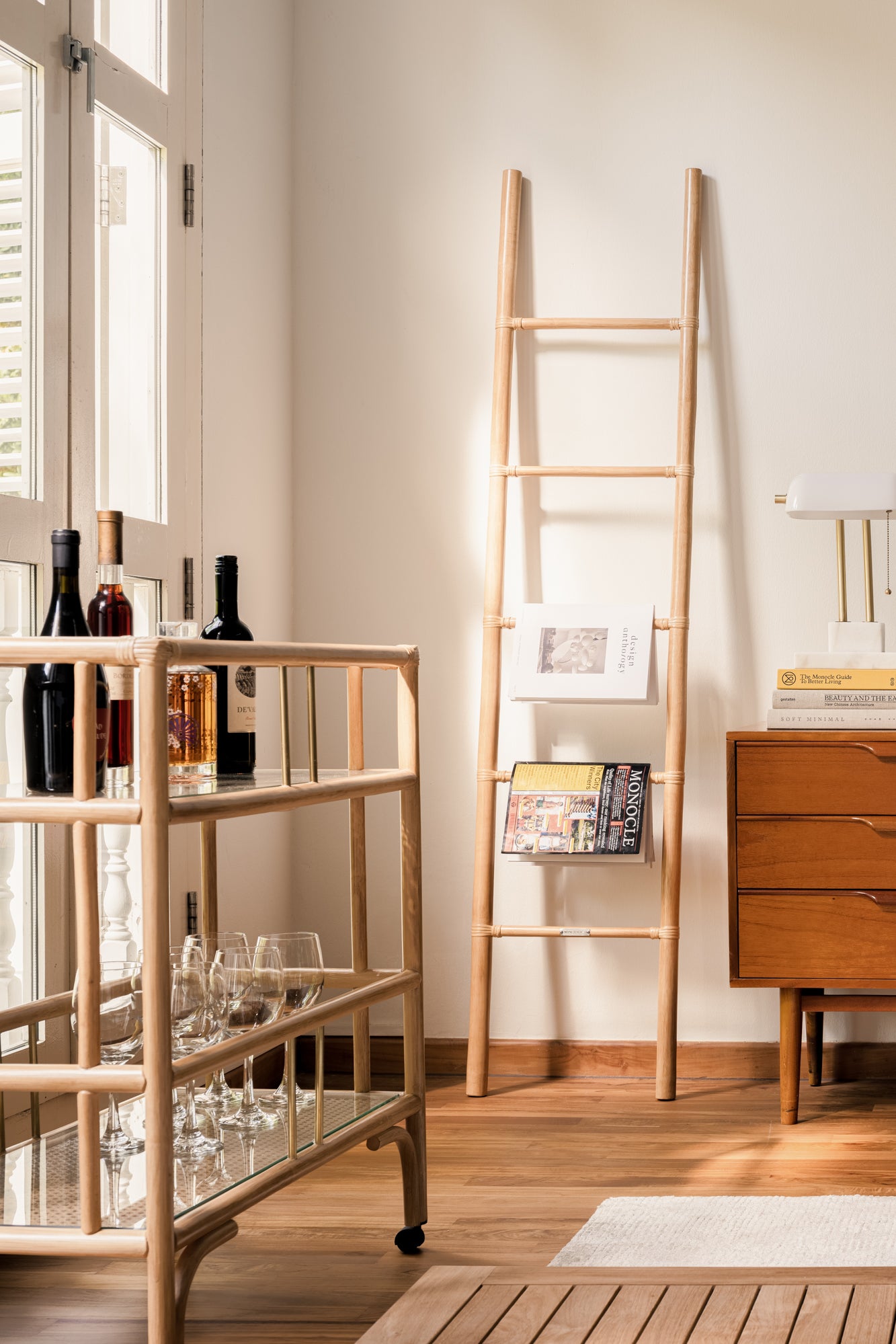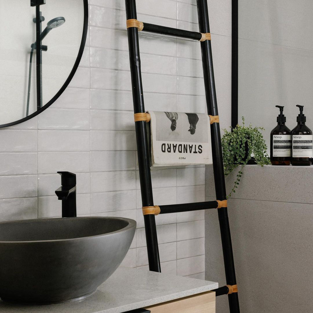 A Peranakan + Luxe inspired bathroom, blends the use of luxe brass accents with the warmth of natural cane in the REI Cane Ladder. The slim footprint of the ladder fits perfectly between the vanity and wall, ideal for towels and adding charm.