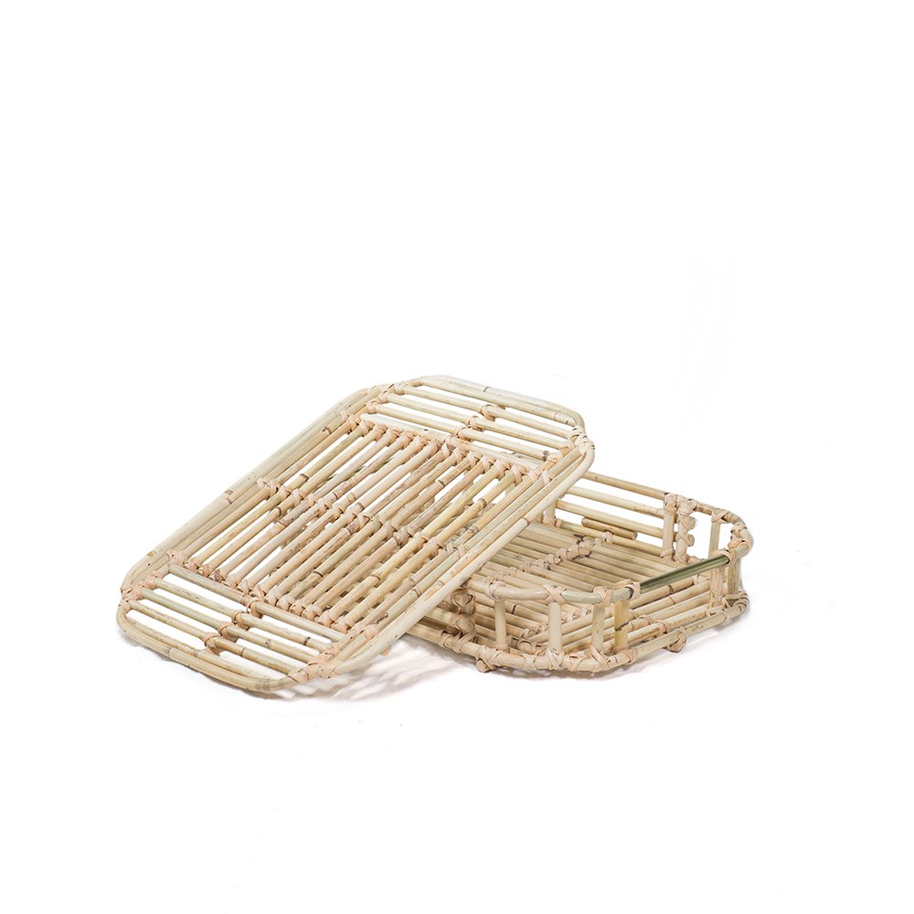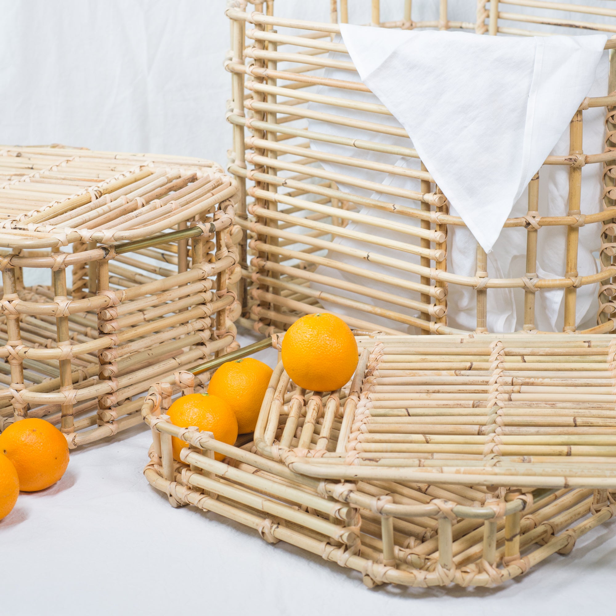 Inspired by our love for the beauty and geometry of Art Deco, a series of trays and baskets hand made by artisans from natural cane and rattan binding, with a touch of brass.